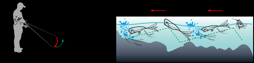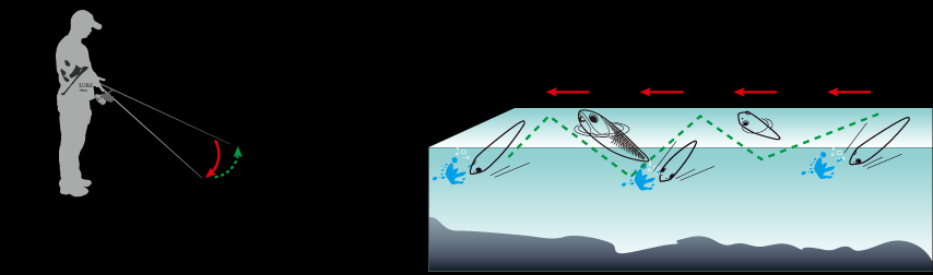 上图操作手法的变式,在路亚下沉到目标水层后,先连续两下轻抽钓竿,随后向上高高扬竿,在这连续三抽过程中,卷线器是不收线的,随后放低竿子再收紧余线。这种操作手法,逼真模拟小鱼逃窜,运用到搜索底层时,效果非凡,鳜鱼类的也特别喜欢攻击。使用这个操作时,手法宜轻缓,这样在目标鱼警戒心高或者活力较低的冬天时,会收到出其不意的效果。