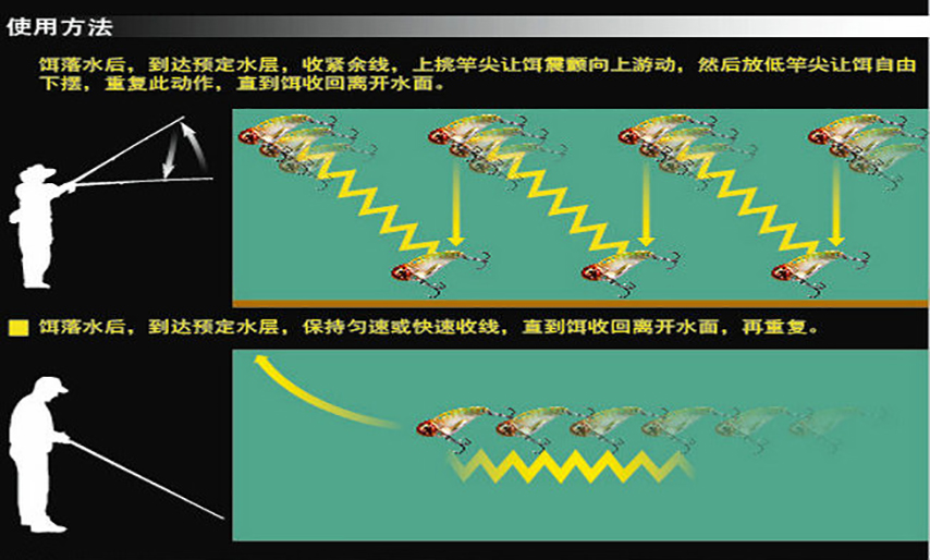 搜索中上层 路亚抛出后即收或者稍等再匀速收线,多数情况下竿尖向下或水平,匀速缓速收线,不需要任何点抽的动作,保持匀速,这在作钓翘嘴过程中非常有效,对轻易不肯就饵的压力鱼尤其有效,低水温环境下作钓也有出色表现!