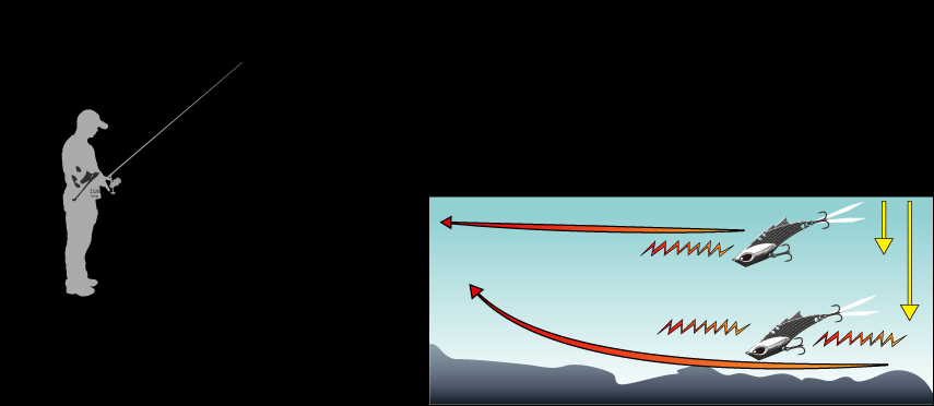 竿尖上举和下指,对于VIB的操控来说你会有明显不同的感觉。上举时,震颤感更加明显,即便慢速收线时也有强烈手感,让你敏锐准确地掌控饵在水下的状态。