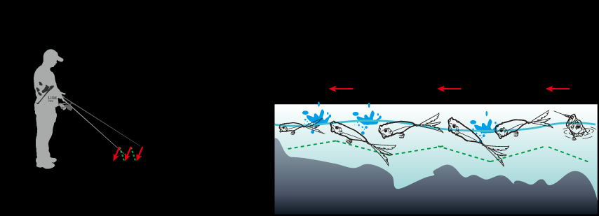 与上图操作相比,加快频率,一秒2抽,减小幅度,每次约10cm,同时抽竿时略带力度,收线节奏与抽竿保持同步,连续不断,要领也是收线与抽竿的配合,此时的浮水铅笔表现在水面小幅急速左右摆,动静非常大,能够将远处的鱼诱惑过来一通猛咬,对大口鲈、海鲈、鳡鱼有特别的诱惑力,但这个钓法对翘嘴似乎效果不好–除非大水面翘嘴群集争食。