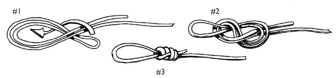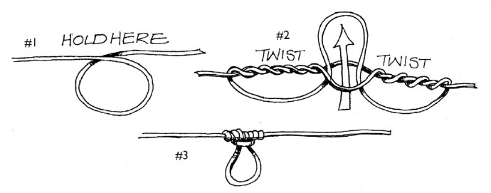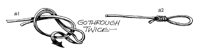 SURGEON’S KNOT 这个线结与上一个线结的用途一样,绑法也比较简单,打结也比较快速,具体绑法如下图。不过要注意绑这个结,有一端的线要比另一端的线要短一些才可以,这样才能方便的在小结里面缠绕。
