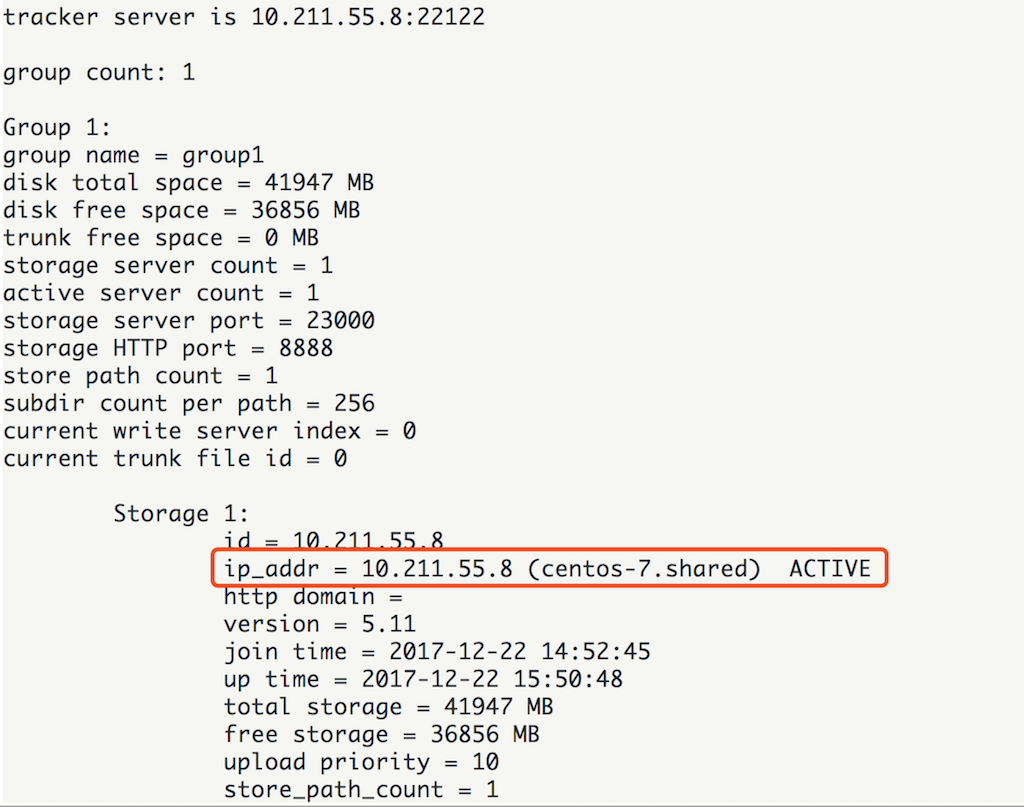 如上所示,看到 ip_addr = 10.211.55.8 (centos-7.shared) ACTIVE 字样即可说明storage服务器已经成功登记到了tracker服务器.