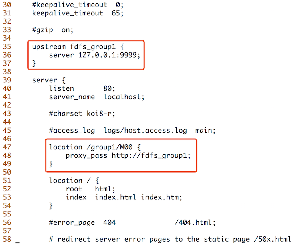 接下来依然是修改nginx2的配置文件,进入conf目录并打开nginx.conf文件加入以下配置,storage的nginx无需修改listen端口,即默认的80端口,并将upstream指向tracker的nginx地址:
