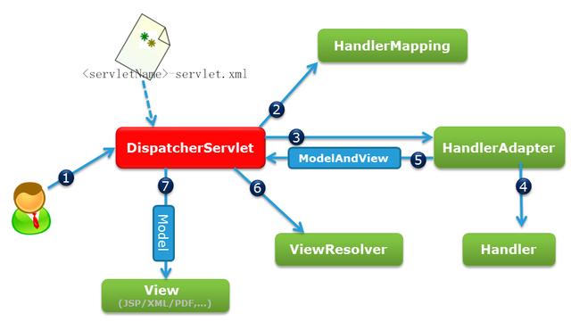- 6、Handler返回的ModelAndView()只是一个逻辑视图并不是一个正式的视图,DispatcherSevlet通过ViewResolver将逻辑视图转化为真正的视图View;